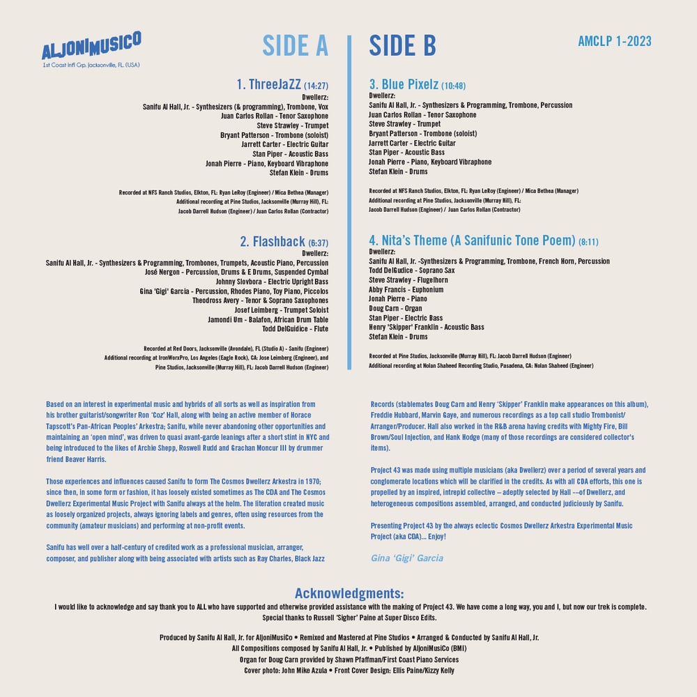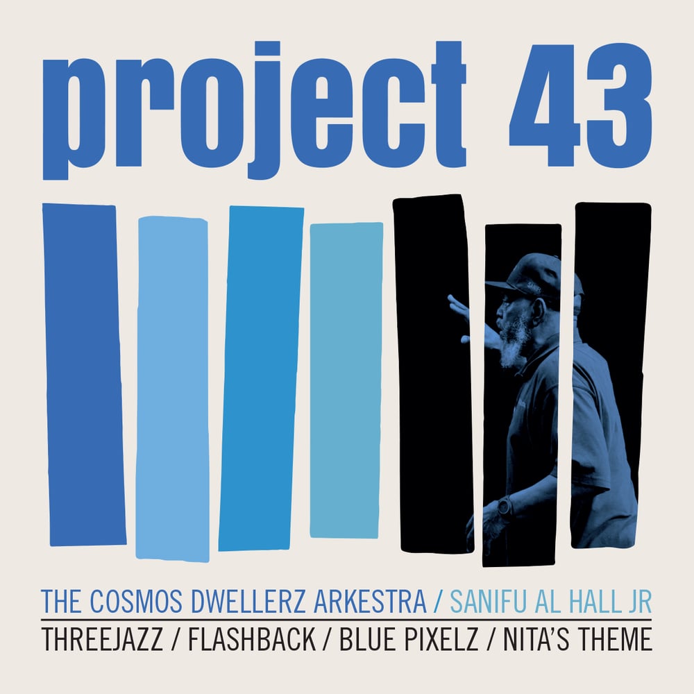 Project 43 was made using multiple musicians (aka Dwellerz) over a period of several years and conglomerate locations which will be clarified in the credits. As with all CDA efforts, this one is propelled by an inspired, intrepid collective–adeptly selected by Hall—of Dwellerz, and heterogeneous compositions assembled, arranged, and conducted judiciously by Sanifu.